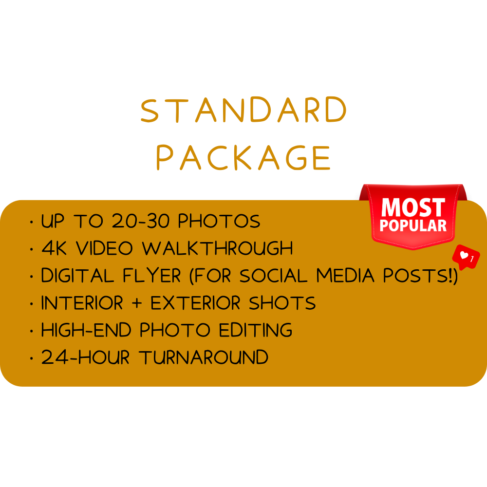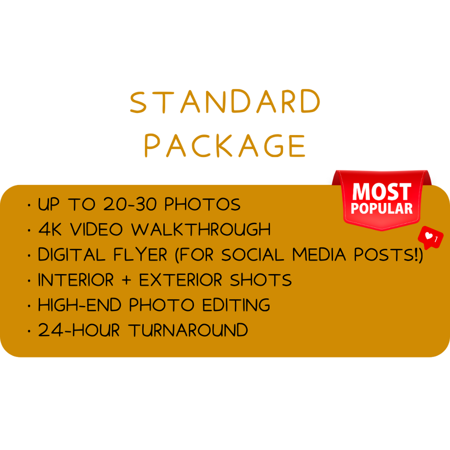 Our most popular package is the Standard Package. It includes 20-30 professional photos using the latest mirrorless camera technology and high-end photo editing. It also includes a 1-3 minute 4K video walkthrough and a digital flyer that you can post on social media (scroll down to see an example).Contact us, and we can work with you to customize this package to meet your needs!We offer additional Add-On Services such as: