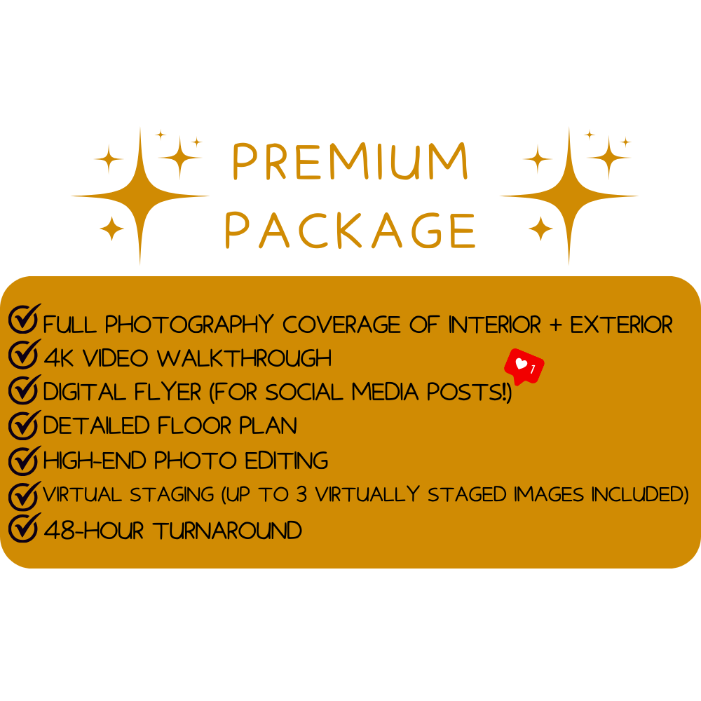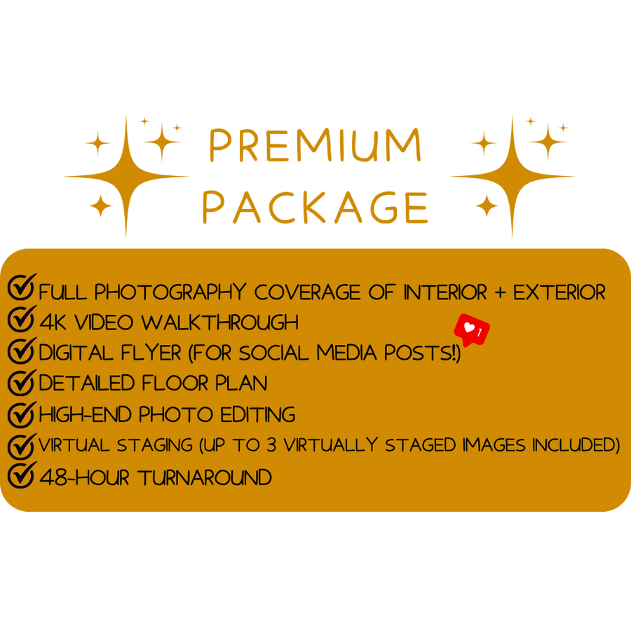 The Premium Package provides full photography coverage of your listing, using the latest mirrorless camera technology. It includes a 1-3 minute 4K video walkthrough, digital flyer (great way to brand yourself on social media), detailed floor plan, and professional high-end photo editing. It also includes 1-3 virtually staged images (and our add-on services give you the option to add more).Find additional Add-On Services Below: